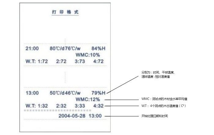 本系统专为检验检疫出口木制品热处理所 用,即可与计算机联网监控,又可以独立使用, 对室内干球温度2组、湿球温度2组、含水率4组, 木芯温度4组,间隔时间,实现自动实时打印,不 可以修改。